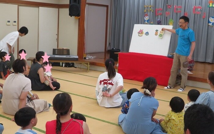 えんがいほいくえんにゃにゅにょさんと一緒に親子で歌や手遊びを楽しみました。