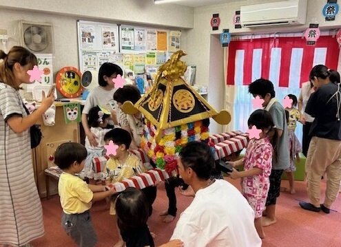 参加者の元気な「わっしょい!わっしょい!」の声の中、パパを先頭にして子どもたちが元気におみこしを担いでいました。