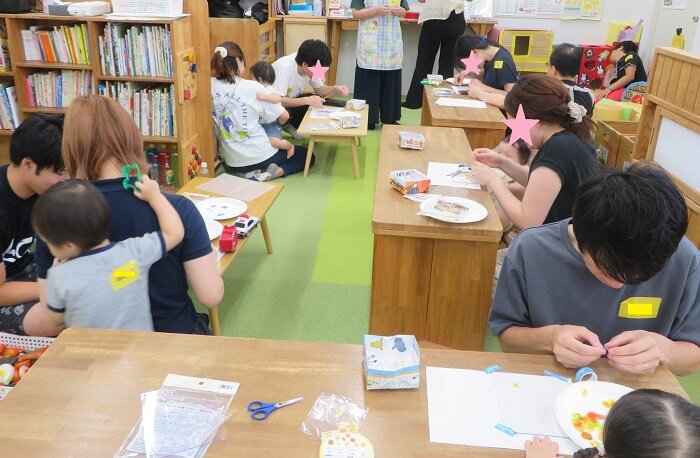 子どもの足形を取った後のシールアートは、パパとママが二人で協力し、他の家族と会話を楽しみながら作りました。