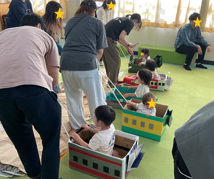 ダンボール電車に子どもを乗せてパパ・ママが引っ張る競技では、子どもたちはとてもうれしそうで、パパもママも子どもの重さに成長を感じたようでした。