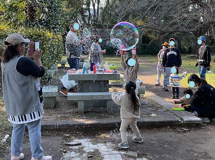 天気がよく、イチョウの木がきれいな広場で、パパが作った大きなしゃぼん玉をうれしそうに追いかける子どもたちを、ママたちは笑顔で写真撮影をしていました。