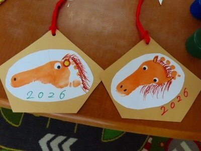 子どもの足形を馬に見立てての絵馬作りでは「新生児以来の足形取りです」と話しながら、久しぶりの制作を楽しんでいました。