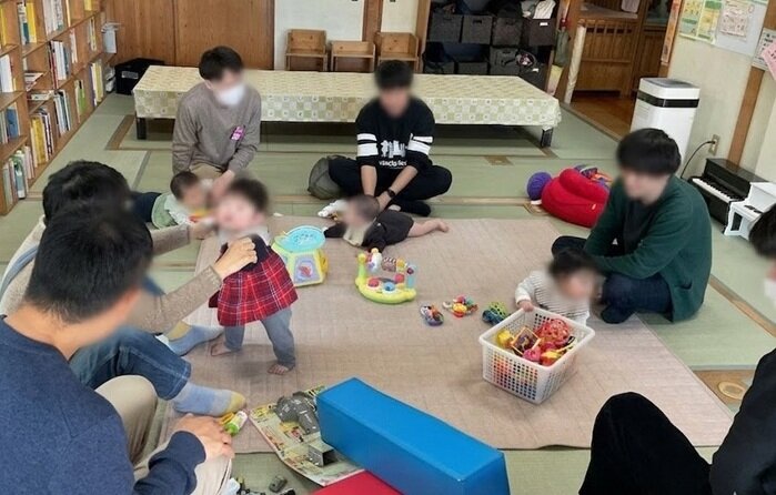 「ハイハイができるようになりました」「お座りが上手になりましたね」とパパ同士がお互いの子どもの成長を楽しそうに話していました。