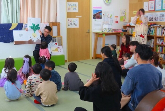リラックス館に戻ってからは、パパ・ママたちが、大型絵本の読み聞かせしてくれました。