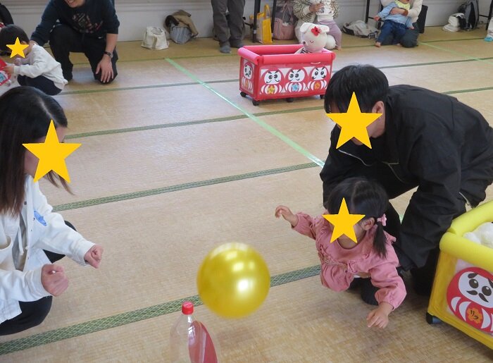 いろいろなサイズのボールを使って、ボール遊びをしました。玉入れしたり、ボールを転がしてキャッチしたり、親子で体を動かし楽しみました。