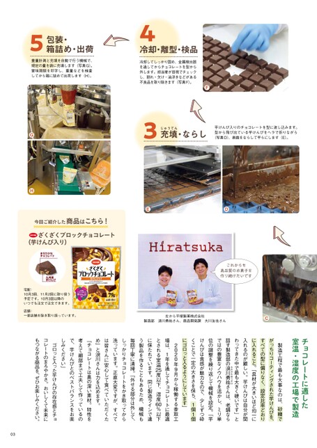 包装・箱詰め・出荷重量計測と充填を自動で行う機械で、規定の量を袋に充填します(写真G)。賞味期限を印字し、重量などを検査してから箱に詰めて出荷します(H)。冷却・離型・検品冷却してしっかり固め、金属検出器を通してからチョコレートを型から外します。担当者が目視でチェックし、割れ・欠け・油浮きなどがある不良品を取り除きます(写真F)。Fじゅうてん填・ならし充芋けんぴ入りのチョコレートを型に流し込みます。型から飛び出ている芋けんぴをヘラで折りながら(写真D)、表面をならして平らにします(E)。GH今回ご紹介した商品はこちら!EDざくざくブロックチョコレート(芋けんぴ入り)チョコレートに適した室温・湿度の工場で製造製造工程で最も大事なのは、砂糖でがっちりコーティングされた芋けんぴを、すべての型に偏りなく、設定比率どおりに入れること。「具材が大きいほど均一に入れるのが難しい。芋けんぴは自分が関わってきた中で最も大きく硬いです」と話す製造部の浪祐さんは、老舗ならではの豊富なノウハウを活かし、ミリ単位の調整を繰り返して機械を設定。「芋けんぴは食感が魅力なので、少しずつ砕くことで一定の大きさを保ち、1個1個にゴロっと入るようにしています」川勇なみかわゆうすけ5度以下、湿度62020年9月から稼働する香取工場は、1年を通してチョコレートに最適0%以下とされる室温2に保たれています。同じ製造ラインで違う製品を作ることもあるため、機械も毎回丁寧に清掃。「外せる部分は外して、しっかりチョコレートをかき取ってから洗っています。正直大変ですが、すべては皆さんに安心して食べていただくため」と浪川さんは力を込めます。「チョコレートは奥の深い素材。特性を考えて細部まで工夫して作っているので、芋けんぴとのベストバランスをお楽しみください」ゴロっと入った芋けんぴの存在感とチョコレートのまろやかさ。おいしくて未来にもつながる商品を、ぜひお楽しみください。03宅配:10月3回、11月2回に取り扱う予定です。10月3回以降のいつでも注文で注文できます。店舗:一部店舗を除き取り扱っています。これからも高品質のお菓子を作り続けたいです左から平塚製菓株式会社製造部浪川勇祐さん、商品開発課大川友也さんC