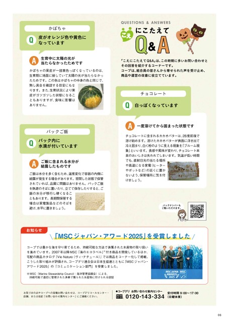 かぼちゃ皮がオレンジ色や黄色になっています生育中に太陽の光が当たらなかったためですかぼちゃの果皮が一部黄色っぽくなっているのは、生育期に地面に接していて太陽の光が当たらなかったためです。この色はかぼちゃの中身の色と同じで、熟し具合を確認する目安にもなります。また、生育状況により果皮がゴツゴツした状態になることもありますが、食味に影響はありません。パックご飯パック内に水滴が付いていますご飯に含まれる水分が結露したものですご飯は水分を多く含むため、温度変化で容器の内側に結露が発生する場合があります。密閉した状態で保管されていれば、品質に問題はありません。パックご飯を熱源のそばに置いたり、立てて保存したりすると、ご飯の水分が移行し硬くなることもあります。長期間保管する場合は家電製品などのそばを避け、水平に置きましょう。にこたえてQ&A「こえにこたえてQ&A」は、この時期に多いお問い合わせとその回答を紹介するコーナーです。コープは、組合員の皆さんから寄せられた声を受け止め、商品や運営の改善に役立てています。チョコレート白っぽくなっています一度溶けてから固まった状態ですチョコレートに含まれるカカオバターは、28度前後で溶け始めます。溶けたカカオバターが表面に浮き出て冷え固まり、白く粉のように見える現象を「ブルーム現象」といいます。食感や風味が変わり、チョコレート本来のおいしさは失われてしまいます。気温が低い時期でも、直射日光の当たる場所や高温になる家電(ヒーターやポットなど)の近くに置かないよう、保管場所に気を付けましょう。バックナンバーもご覧いただけます。お知らせ「MSCジャパン・アワード2025」を受賞しましたコープでは豊かな海を守り育てるため、持続可能な方法で漁獲された水産物の取り扱いを進めています。2007年以降MSC「海のエコラベル」※付き商品を開発しているほか、宅配の商品カタログ『VieNature(ヴィ・ナチュール)』では商品をコーナー化して掲載。こうした取り組みが評価され、コープデリ連合会は日本生協連とともに「MSCジャパン・アワード2025」の「コミュニケーション部門」を受賞しました。※MSC(MarineStewardshipCouncil:海洋管理協議会)による、持続可能で適切に管理された漁業で獲られた水産物に付けられる認証お気づきの点やコープへの各種お問い合わせは、コープデリコールセンター・店舗、または右記「お問い合わせ案内センター」にご連絡ください。●コープデリお問い合わせ案内センター0120-143-334受付時間9:00〜17:00(日曜休業)06