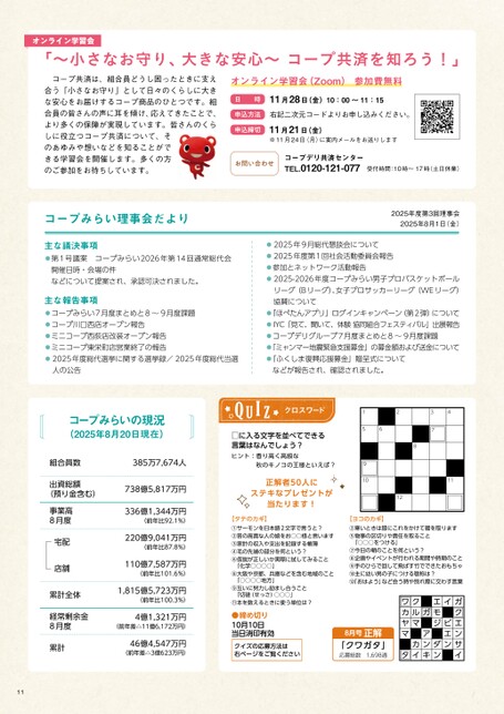 オンライン学習会「~小さなお守り、大きな安心~コープ共済を知ろう!」コープ共済は、組合員どうし困ったときに支え合う「小さなお守り」として日々のくらしに大きな安心をお届けするコープ商品のひとつです。組合員の皆さんの声に耳を傾け、応えてきたことで、より多くの保障が実現しています。皆さんのくらしに役立つコープ共済について、そのあゆみや想いなどを知ることができる学習会を開催します。多くの方のご参加をお待ちしています。オンライン学習会(Zoom)参加費無料日時申込方法申込締切11月28日(金)10:00~11:15右記二次元コードよりお申し込みください。11月21日(金)※11月24日(月)に案内メールをお送りしますお問い合わせコープデリ共済センターTEL.0120-121-077受付時間:10時~17時(土日休業)コープみらい理事会だより主な議決事項⃝第1号議案コープみらい2026年第14回通常総代会開催日時・会場の件などについて提案され、承認可決されました。主な報告事項⃝コープみらい7月度まとめと8~9月度課題⃝コープ川口西店オープン報告⃝ミニコープ西荻店改装オープン報告⃝ミニコープ東栄町店営業終了の報告⃝2025年度総代選挙に関する選挙録/2025年度総代当選人の公告2025年度第3回理事会2025年8月1日(金)⃝2025年9月総代懇談会について⃝2025年度第1回社会活動委員会報告⃝参加とネットワーク活動報告⃝2025-2026年度コープみらい男子プロバスケットボールリーグ(Bリーグ)、女子プロサッカーリーグ(WEリーグ)協賛について⃝「ほぺたんアプリ」ログインキャンペーン(第2弾)について⃝IYC「見て、聞いて、体験協同組合フェスティバル」出展報告⃝コープデリグループ7月度まとめと8~9月度課題⃝「ミャンマー地震緊急支援募金」の募金額および送金について⃝「ふくしま復興応援募金」贈呈式についてなどが報告され、確認されました。コープみらいの現況(2025年8月20日現在)組合員数385万7,674人出資総額(預り金含む)事業高8月度宅配店舗累計全体経常剰余金8月度累計738億5,817万円336億1,344万円(前年比92.1%)220億9,041万円(前年比87.8%)110億7,587万円(前年比101.6%)1,815億5,723万円(前年比100.3%)4億1,321万円(前年差△11億6,172万円)46億4,547万円(前年差△3億623万円)11クロスワード□に入る文字を並べてできる言葉はなんでしょう?ヒント:香り高く高級な秋のキノコの王様といえば?正解者50人にステキなプレゼントが当たります!159102643781211【タテのカギ】【ヨコのカギ】「化学○○○○」「○○○○地方」⑧大阪や京都、兵庫などを含む地域のこと①サーモンを日本語2文字で言うと?②昔の高貴な人の娘をお○○様と言います③家計の収入や支出を記録する帳簿④毛の先端の部分を何という?⑥仮説が正しいか実際に試してみること⑨互いに努力し励まし合うこと「切磋(せっさ)○○○」⑪本を数えるときに使う単位は?●締め切り10月10日当日消印有効クイズの応募方法は右ページをご覧ください②寒いときは膝にこれをかけて暖を取ります⑤物事の区切りや責任を取ること「○○○をつける」⑦今日の朝のことを何という?⑧企画やイベントが行われる期間や時期のこと⑨手のひらで回して飛ばす竹でできたおもちゃ⑩主に幼い男の子につける敬称は?⑫「おはよう」など会う時や別れ際に交わす言葉ワクカルガモヤママエイガクジビエエンカンダンサイタイキンア8月号正解「クワガタ」応募総数1,698通