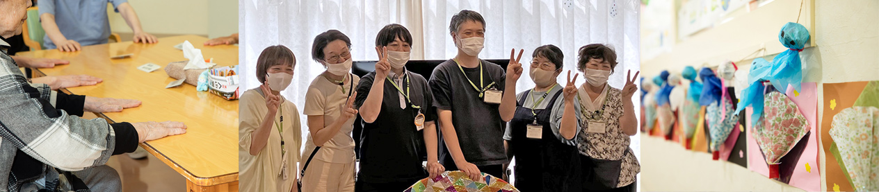 障害福祉サービスケアプランに基づき、入浴や食事、体操や機能訓練、趣味活動などを通じて心身の機能維持・回復を目指します。